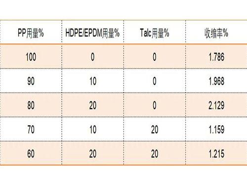 聚丙烯(PP)、高密度聚乙烯(HDPE)和三元乙丙橡膠(EPDM)等是汽車內(nèi)外飾件復(fù)合材料的基體組分,以聚丙烯為主材,高密度聚乙烯和三元乙丙橡膠為添加劑,三者的質(zhì)量比不同,材料的收縮率也有較大的差別,如表1所示。表1 HDPE、EPDM、Talc對PP收縮率的影響注:HDPE與EPDM的質(zhì)量比為1:1,Talc為1250目。從表1可以看出,純PP的…