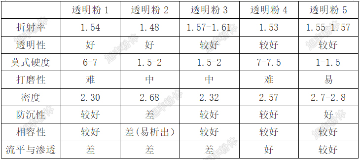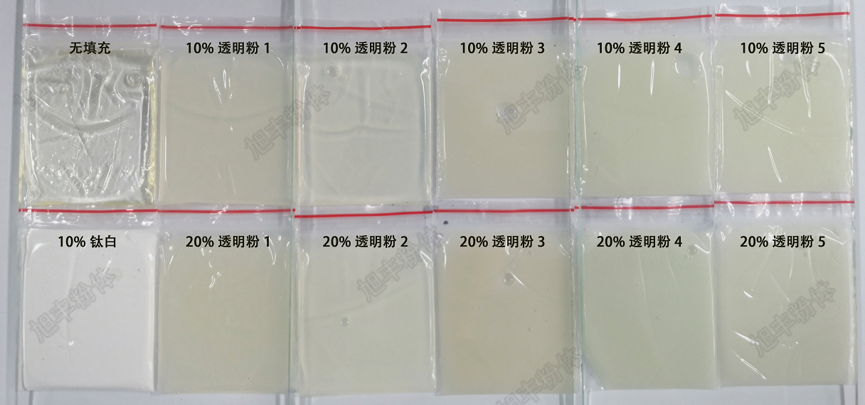 注:透明粉1、透明粉2屬于藍(lán)相,在黃光下拍照顯現(xiàn)的透明性稍差于透明粉3、透明粉4、透明粉5這類(lèi)黃相填料。