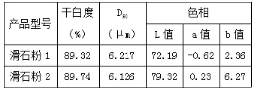 白度(whiteness)是表示物質(zhì)表面白色的程度,以白色含有量的百分率表示。非金屬礦物粉體的白度有干白度和濕白度之分,干白度是反映非金屬礦物粉體表觀的白色程度;濕白度是反映非金屬礦物粉體在油性介質(zhì)中,還原粉體原礦色相后的白色程度。故在實際應(yīng)用過程中,我們會發(fā)現(xiàn),兩支粉體的干白度檢測結(jié)果接近,但生產(chǎn)出來的成品顏色卻完全不同。為此,我司進(jìn)行了如下實驗:選擇兩支干白度比較接近的滑石粉,按同一配方比例填充于PET(聚對苯二甲酸乙二醇酯),粉體檢測結(jié)果詳見下表。