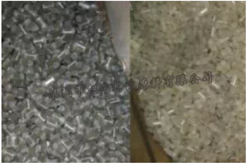 實驗結(jié)果如下圖所示,左邊粒料填充的是滑石粉1,右邊粒料填充的是滑石粉2,實驗結(jié)果表明在滑石粉干白度、細(xì)度等指標(biāo)接近的情況下,滑石粉1色相為冷色系,L值較小,生產(chǎn)的粒料偏暗;滑石粉2色相為暖色系,L值較大,生產(chǎn)的粒料較亮。